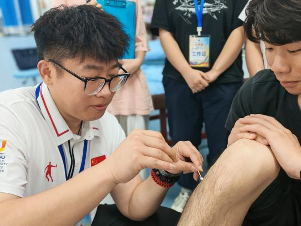 比赛期间,防护小组在场边设应急医疗站,配备冰袋、绷带、肌贴、便携式超声仪、针灸针等专业设备,实时关注选手状态。