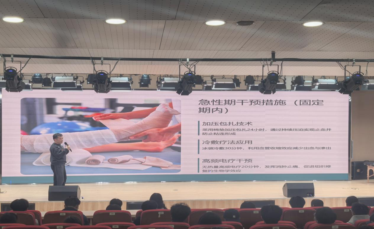 黄仁楚主任围绕“运动损伤康复”“术后功能重建”“慢性劳损干预”三大方向,结合自身临床经验,系统解析了肩袖损伤、膝关节韧带撕裂、踝关节扭伤等常见创伤的康复路径。通过动态演示与案例对比,生动展示了关节活动度训练、肌力平衡调节、本体感觉重建等关键技术在临床中的实际应用,并针对不同患者群体提出个性化康复方案设计要点。在“踝关节扭伤分级康复”案例中,黄主任以运动队伤病管理为例,从急性期冰敷制动到恢复期本体感觉训练,层层递进讲解了“渐进式抗阻训练”的科学逻辑;在“膝关节置换术后康复”环节,结合影像学资料,剖析了步态分析与关节负荷控制的关键节点,强调“精准评估-分阶段干预-长期随访”的闭环管理理念。期间,黄主任还就“运动康复技术标准化”“医体协同机制建设”等议题与同学们展开深入交流。案例教学模式将抽象理论转化为可操作的方法论,为临床实践提供了清晰的技术路线图,也为课程改革注入了新视角。